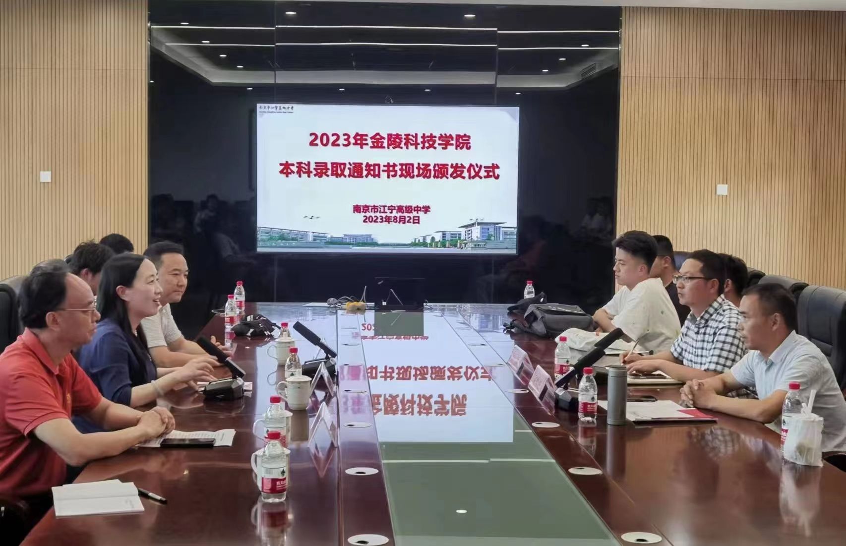 8月2日下午3点,金陵科技学院党委常委、副校长顾晓燕一行前往学校“优质生源基地”一一南京市江宁高级中学,举行了本科录取通知书现场颁发仪式。南京市江宁高级中学张格波副校长、高三年级组倪仁宗副主任、我校招生与就业指导处闵光琛处长、艺术学院鲍锐副书记、本科招生办刘亚斌主任以及29位录取新生、部分新生家长参加了仪式。